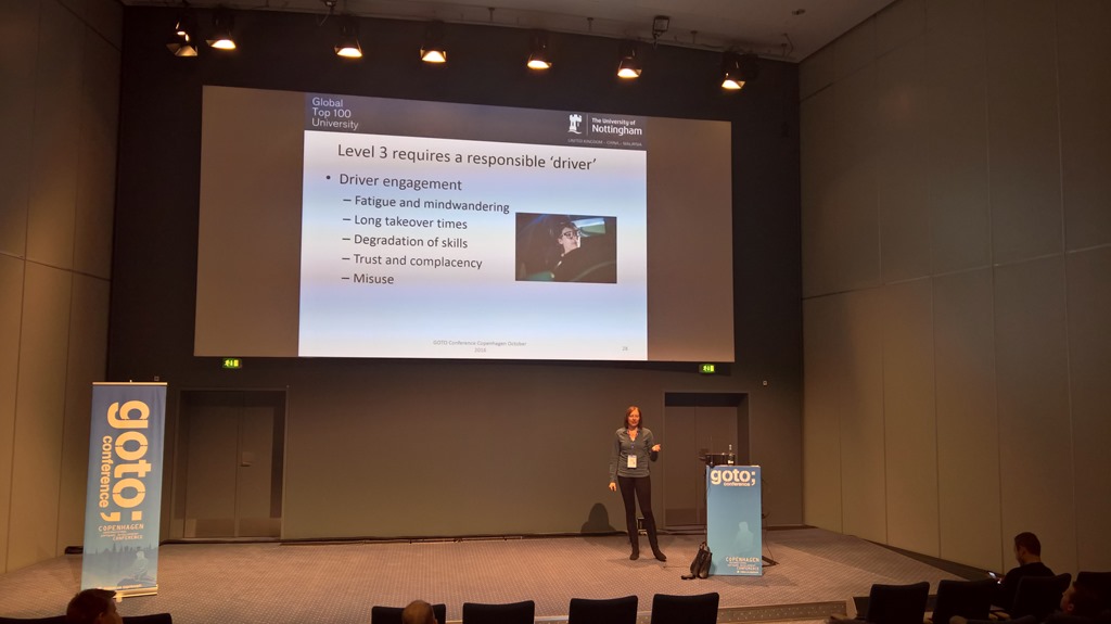 With this in mind I went to Sanna Pampels talk called “Automated driving - are we taking the human factors researcher out of the loop?”. The talk was relly good with Sanna starting out by covering the different levels of automation. Going from a level 0 with no automation, over different levels of assisted and partially automated driving to level 5 which is full automation or autonomous cars.